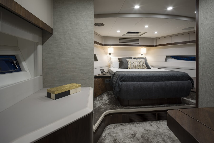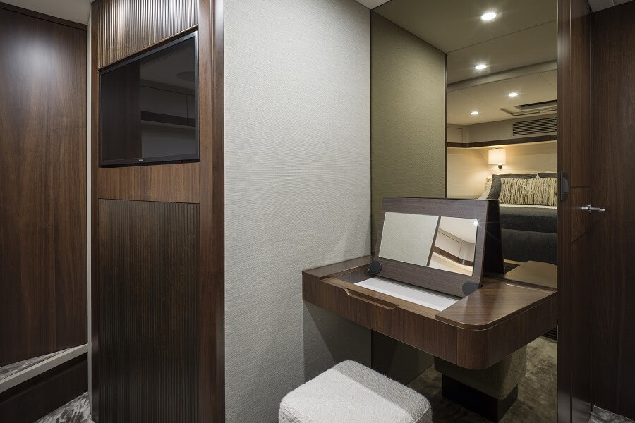 The standard VIP suite has an aft-facing double, cupboards on both sides and en-suite to port. In the extended VIP layout, the bedroom door is to port, where there’s bathroom access and a long storage cabinet. At the foot of the bed is a vanity table with large bulkhead mirror beside a Samsung TV with fluted panelling above and below.