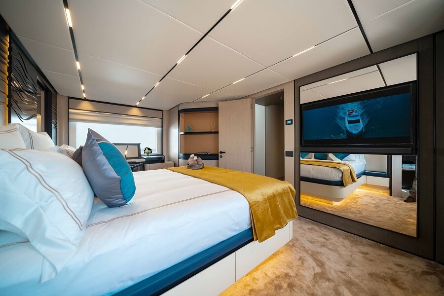 Founded in the Netherlands in 2019 by three Design Partners – Spaniard Raquel Hernandez Grijota, Canadian Sean Bekeschus and Dutchman Fabian Henke – along with Commercial Director Jacob van de Haar, Phathom designed the exterior and interior of the Majesty 111 from scratch. For the tri-deck Nomad 101, an extended version of the Nomad 95 with an added sun deck, the studio collaborated with Gulf Craft on the exterior upgrade while revitalising the interior with natural or sustainable materials. On the new-look Nomad 70 SUV, the company designed the new eco-friendly interior and contributed to its external facelift. The Majesty 72 has a beam of 19ft 5in and forward-angled hard top supports However, Phathom’s first project with Gulf Craft was the interior of the Majesty 72, a 75GT flybridge motor yacht that had initially debuted in front of a smaller audience at the Abu Dhabi International Boat Show last October. Mohammed Alshaali, Chairman of Gulf Craft, was convinced to work with Phathom based on the ideas the young designers offered for the Majesty 72, which is 1ft 5in longer and 1ft 8in wider than the former Majesty 70 and a world away in terms of exterior and interior refinement. “Phathom approached us as a young studio with fresh concepts. We thought they had some good ideas for the market – new, fresh and inspirational,” says Alshaali, who co-founded Gulf Craft in 1982 and developed it into the Middle East’s leading yacht builder, renowned for the world’s largest production fibreglass superyacht, the Majesty 175. The warm, yellow-toned Sirocco décor is among two themes offered by Phathom Studio “We decided to go with them and we liked what they’ve done on the Majesty 72. Now we’re selling mostly in Europe, US, Australia, so our designs have changed to accommodate the customers and the new 72 is different, more of a European style.” EUROPEAN STYLING Compared to the Majesty 70 and other previous models like the 75, the Majesty 72 has a far more modern exterior, with fluid lines and a long, shapely band of glazing replacing the potted series of hull windows and portholes seen on its predecessors. The foredeck features a three-sided sofa and a table The 72 is the most recent addition to Majesty’s Yacht Collection, following the Majesty 62 and Majesty 62M, but this flybridge design is a cut above, with forward-angled hard top supports nicely echoing the lines of the main-deck superstructure below. In fact, from afar, it’s comparable to some of its European-built counterparts, but is notably different in at least one aspect – beam. The Majesty 72 is significantly wider than many similar-length competitors. It’s over 1ft beamier than longer models from two renowned Italian builders and a full 1ft 6in wider than a British-built model that’s almost 3ft longer. The large aft cockpit features a fitted sofa and table, and a port counter with fridge The beam is first noticeable when boarding the swim platform, where six stairs on each side lead to a large 16sqm (172sqft) cockpit with a relatively clean, conventional design. A forward-facing sofa faces a long table, with plenty of space for three chairs on the forward side plus one more at each end. There’s a fridge with a countertop in the port corner, where the saloon doors slide behind each other and offer an open invitation to the saloon. This is where the Majesty 72 really comes into its own. WINDSWEPT FINISHES Huge windows on each side illuminate the 35sqm main-deck interior, which is formed of three areas: the saloon, the dining area and galley, and the helm station and raised companion seating. The interior layouts on both main and lower decks were initiated by Gulf craft’s in-house designers, who then collaborated with Phathom to fine-tune the GAs, furniture, fittings and material choices. The main deck features stained white oak flooring For the material trims, Phathom offers owners the option of Sirocco or Chinook themes. Named after warm winds from the Sahara to Mediterranean, Sirocco is the warmer, yellow-dominated theme. Chinook, named after coastal and interior winds in western North America, is a cooler, blue-themed finish using desaturated woods. “To emphasise this conceptual direction, we’ve included a very soft interior architecture ‘windswept’ with accents indicative of wind patterns,” says Grijota, who attended this year’s Dubai show with Bekeschus and Van de Haar. “The wall design of the headboards in all of the cabins exhibit this design detail,” adds the Spanish designer, whose career includes time with Dutch studios Sinot and Guido de Groot Design. Alshaali, for one, is delighted with the finish of the interior, which reflects the builder’s focus on a more international market following its extensive success in Europe, the US and Australia. Forward view of the U-shaped galley to port “One priority for designers is to give the feeling of open space. You feel the space here. This is a relatively small yacht compared to our superyachts, but you feel it’s bigger than most yachts of this length,” Alshaali says. “We wanted something different, new, modern, which is what we’ve found with Phathom. Plus, they emphasise earthy, environmentally friendly materials and that was important. For example, they use old teak decking to make the floor, they use fish nets and other fabrics to make the carpet, so they have these kind of ideas, which we liked very much. It goes with our theme.” LIVING, DINING & SLEEPING The yacht’s vast beam is immediately felt upon entering the lounge, where a long L-shaped sofa to port faces another long sofa along the starboard side. To starboard, there’s fitted shelving in the aft corner and a 55-inch pop-up TV behind the sofa. The eight-seat dining table to starboard Forward is a long dining table for eight, with chairs at each end and three chairs on port side, and a fitted three-seat sofa to starboard, although it’s a tight squeeze 