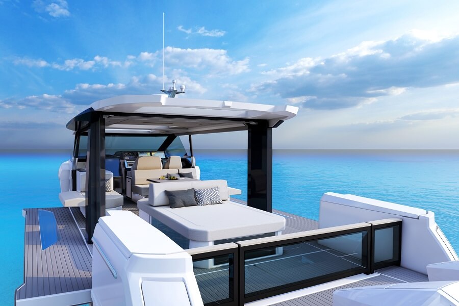 A new glass transom increases sea views from the cockpit and connectivity to the water, while balconies on either side of the cockpit significantly increase usable deck space and create a ‘private island’ experience at anchor.