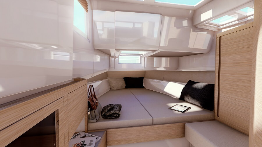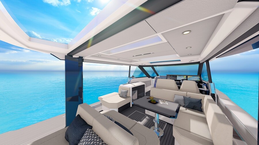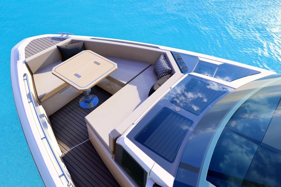 Fitted furniture starts aft with an island sunpad, with the forward end doubling as a forward-facing sofa that’s part of seating on all four sides of the central table. The twin-seat helm station is to starboard and there’s an outdoor galley to port, where a single side deck leads to a foredeck featuring U-shaped seating and a table.