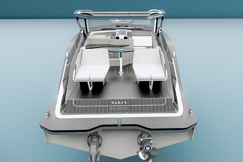 Designed for warm climates, the SK Renanda One features two fixed lounge beds that face aft over the swim platform and can double as facing sofas. Forward, under a hardtop, are bench seats either side of an adjustable table, a wet bar and a central helm seat. An open version without hardtop is also available.