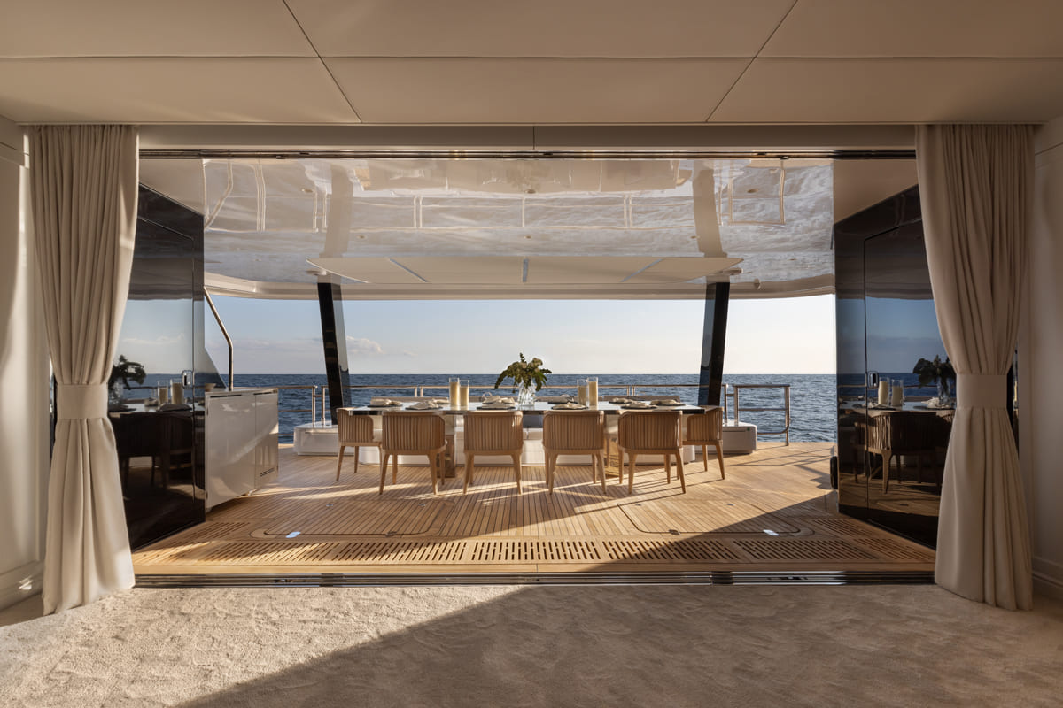 One of the yacht’s most notable features is a partially enclosed flybridge, which houses a custom cigar lounge and 85-inch television. The 16m-wide walkaround beach club is another highlight, featuring foldout platforms and an invisible aft garage that provides easy access to water toys and diving equipment.