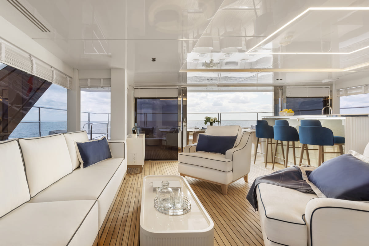 The yacht’s main deck, an airy space to relax with a bar and a large TV, leads to an open cockpit