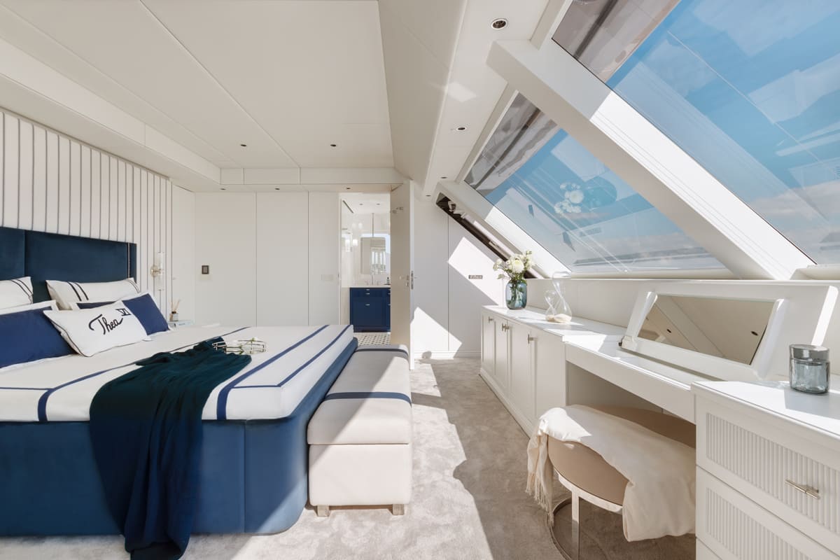 Take in blue skies and sea views from the master suite which has private bow terrace access