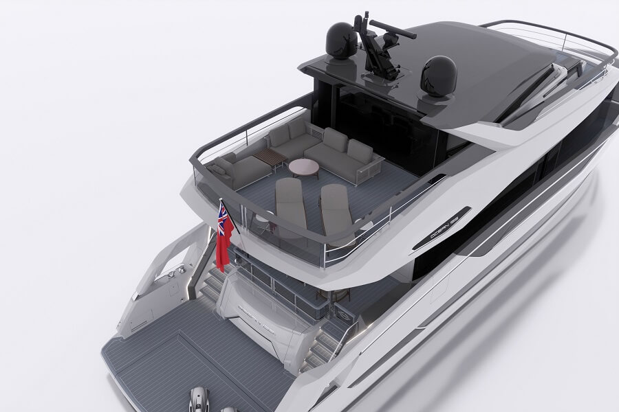 Designs show a large hydraulic swim platform overlooked by an infinity aft cockpit featuring modular furniture. The interior features full-height glazing, sliding doors on both sides and a glazed, floating staircase set midships and to port of the centreline.