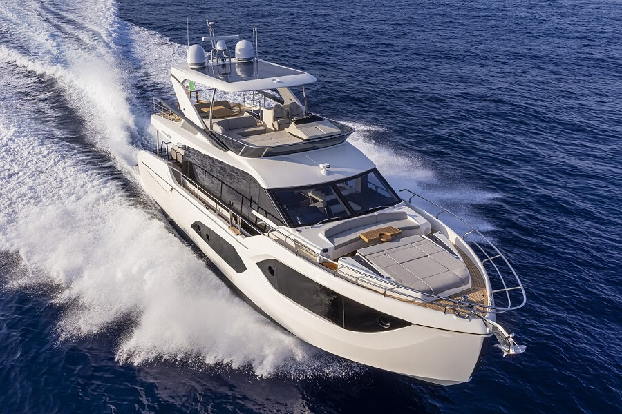 Showing its focus on a greener future, Absolute has included solar power on the first hull of its 60 Fly, a model with a clear cockpit and aft flybridge designed for modular furniture, as well as a memorable master suite located forward on the lower deck.