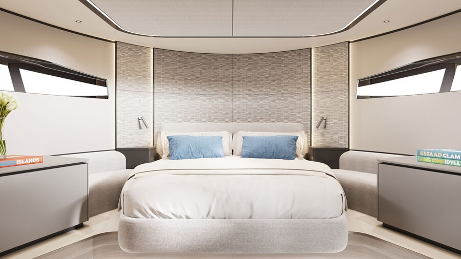 “The Edge 65 is a seriously cool yacht that offers a fabulously fast drive, and my new design aims to encapsulate the onboard experience. Clean lines and shapes, and very light spaces are blended with grey and black tones to provide an easy-on-the-eye sense of harmony. From the delightful outdoor dining to the ultra-comfy cabins and bathrooms, this yacht is equally pleasurable on day trips and overnight cruises.”