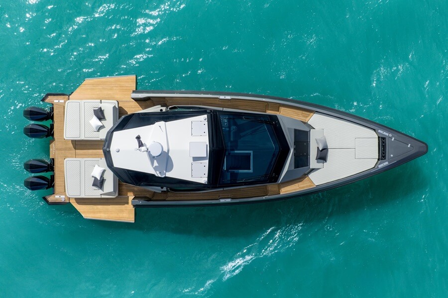 Lounging areas includes two double island sunpads on the aft deck, with a central walkway offering easy boarding and disembarkation. Symmetrical fold-down sides increase the usable deck space by over 5sqm and create balconies over the sea, which is even more important on the outboard X version due to its row of outboards along the aft platform.